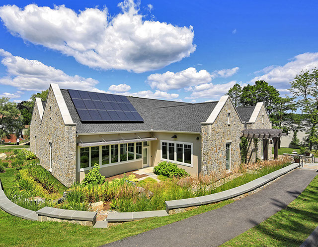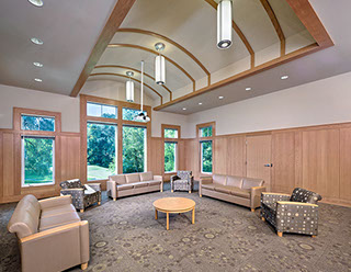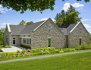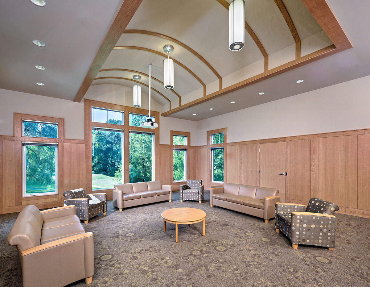 This 8,850 square foot structure includes four science lab classrooms, two math classrooms, offices, prep rooms, a large common room and support spaces. The design echoes forms and materials native to the 80 year old school and the surrounding Litchfield hills.
