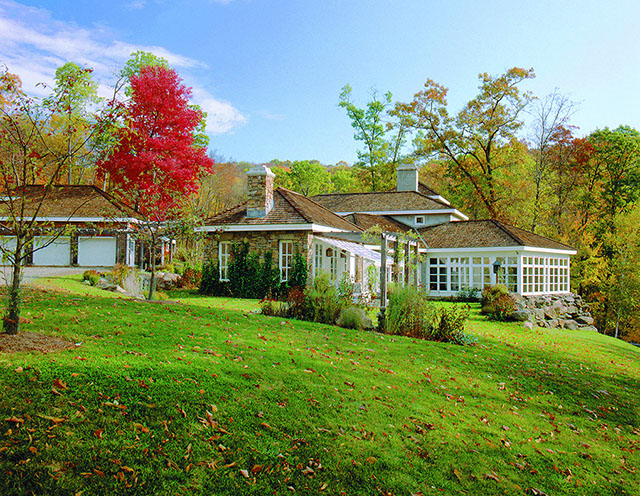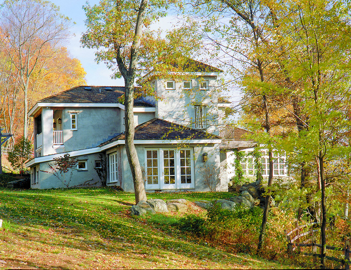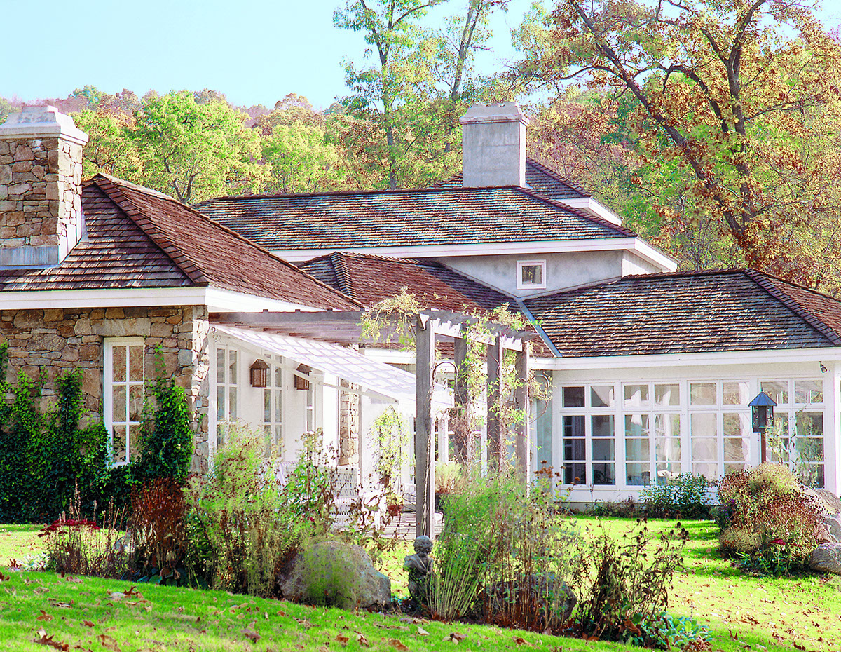Modeled after vernacular Italian farm structures, this free flowing stucco and cedar home is sited to take advantage of an adjacent stream and views of Lake Waramaug.