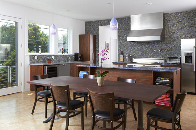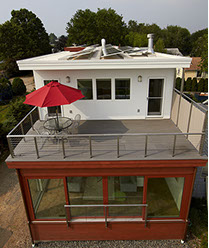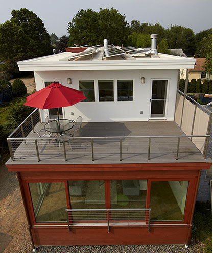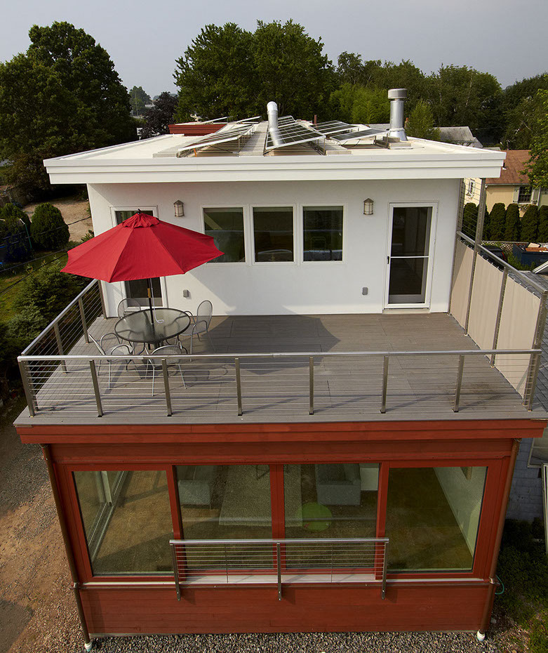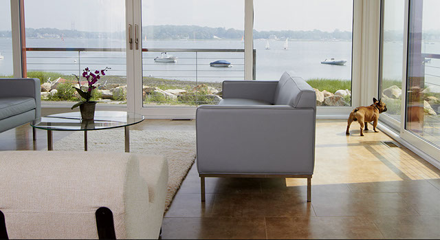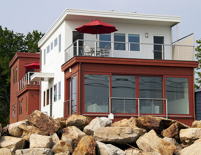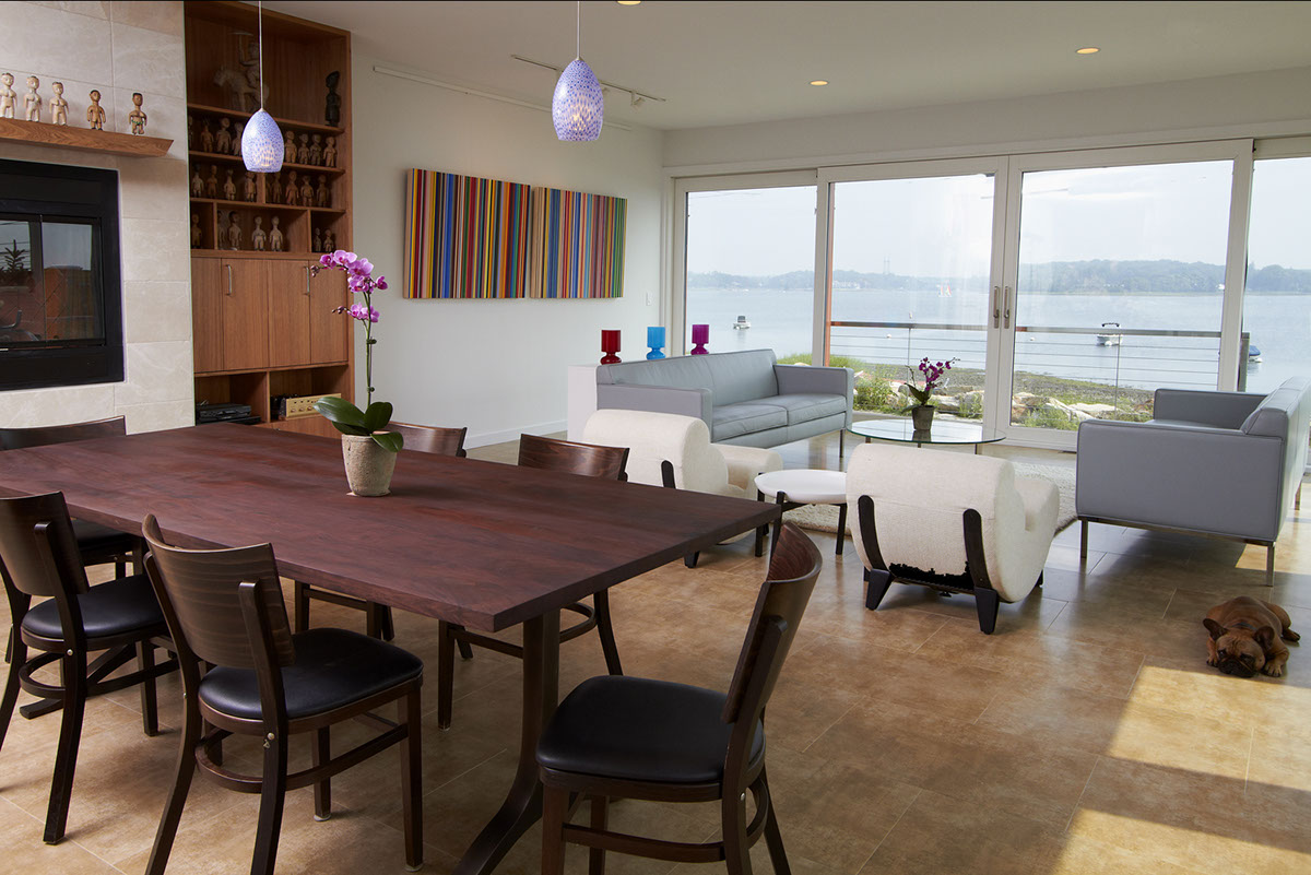Designed to withstand high winds and frequent flooding, this Energy Star rated contemporary features great views of Westport’s Saugatuck River Inlet.
