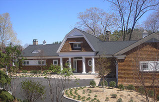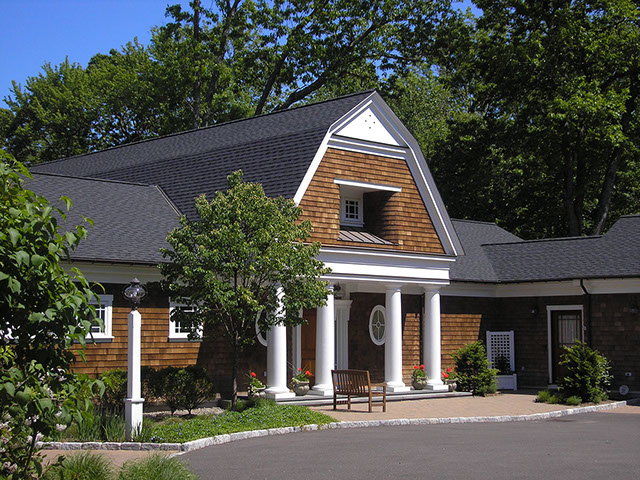 This Shingle Style residence was designed for an empty nester couple with single level living in mind.