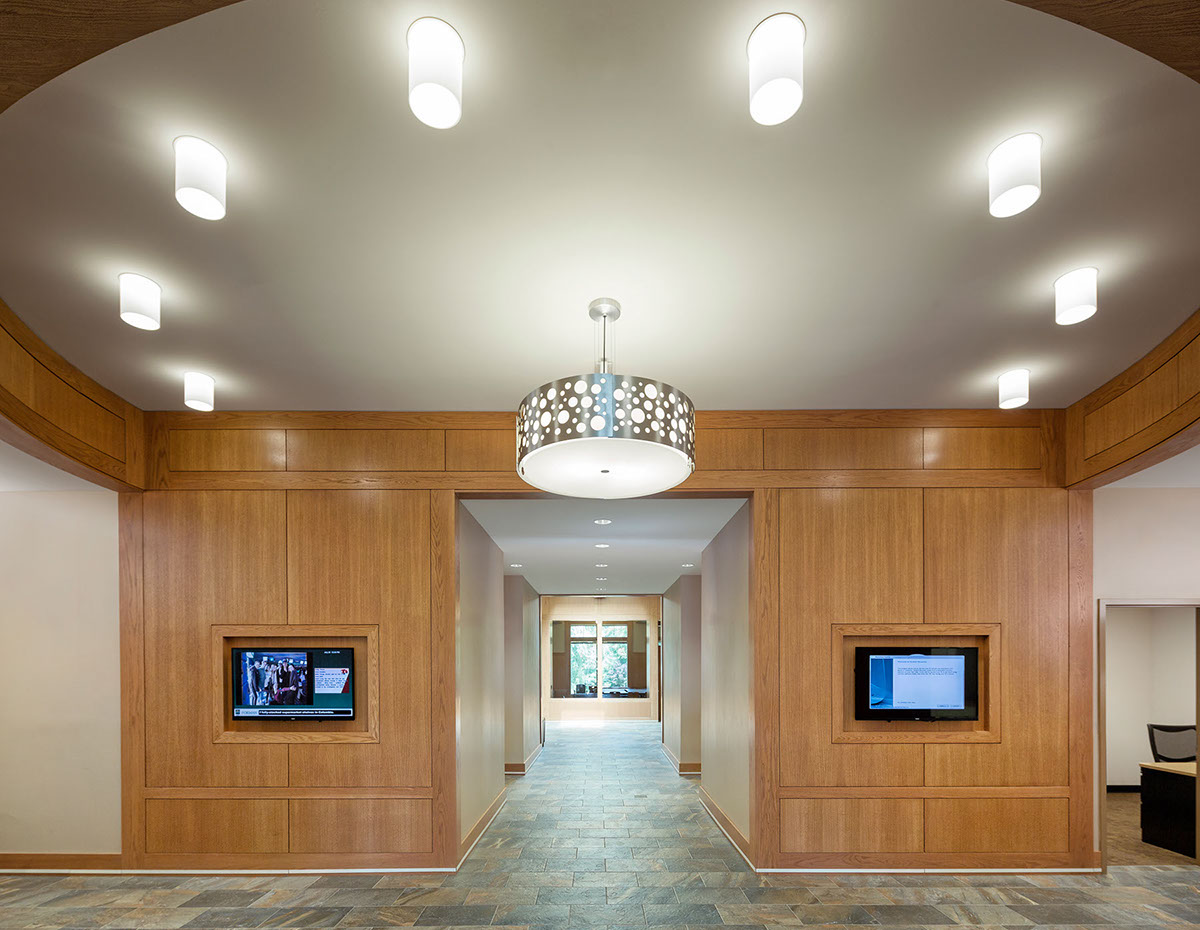This 8,850 square foot structure includes four science lab classrooms, two math classrooms, offices, prep rooms, a large common room and support spaces. The design echoes forms and materials native to the 80 year old school and the surrounding Litchfield hills.